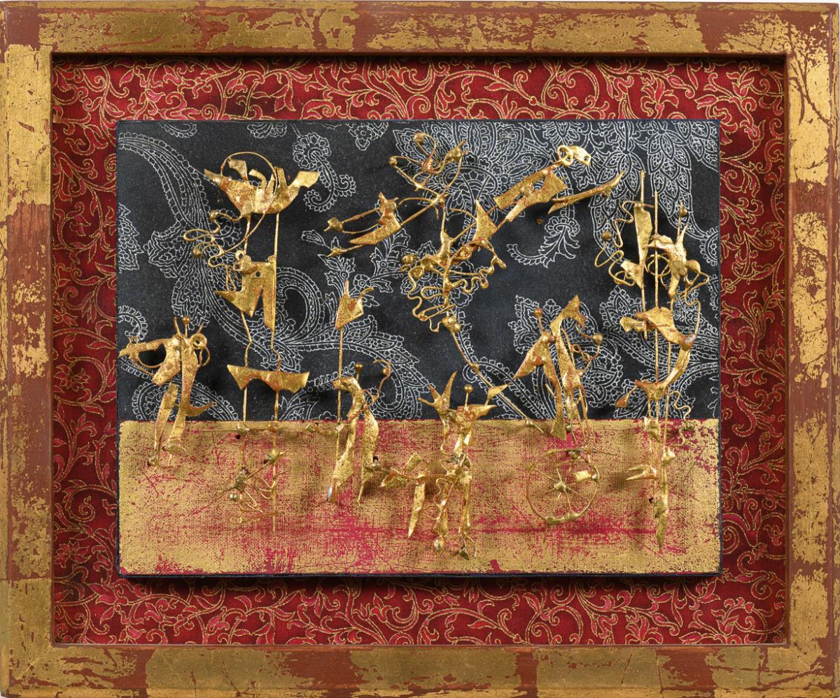 Probably acrylic / patterned textile / wood with figural metal applications. Signed/titled on verso. Dated on verso: 2006.