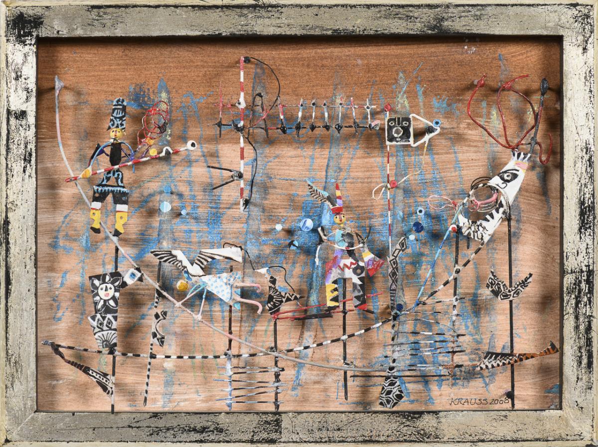 Mixed media with figural metal applications. Signed lower right. Dated: 2008.