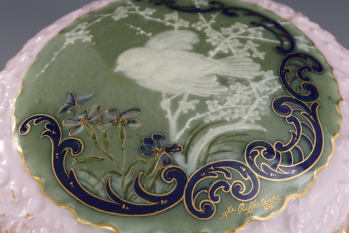 Pressed bulged box with rocaille relief and pink background. On the lid a medallion with underglaze green stock with a titmouse painted in pâte-sur-pâte technique, sitting on a flowering branch, framed by a cobalt blue, gold contoured rocailleranke; gold-staffiert. Minimal gold abrasion on the inner rim.