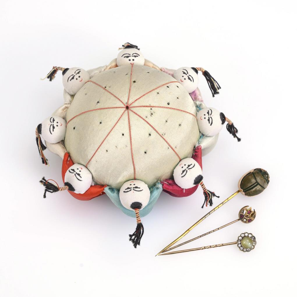 Various pinheads (including cat's eye cabochon, rose diamonds, scarab, rhinestone, enamel, artificial pearls) on pins. In addition, younger pincushion.