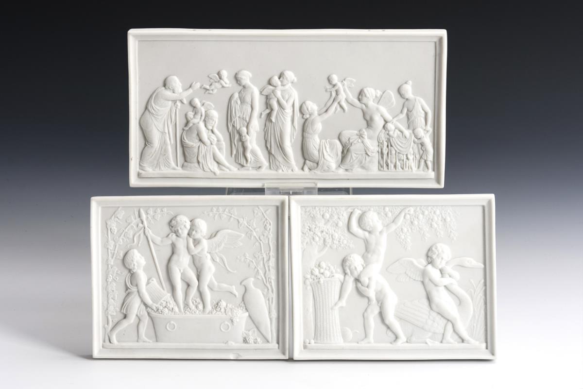 Relief depiction after Bertel Thorvaldsen (1770 Copenhagen - 1844 ibid.) 1x the relief "The Age of Love": figure-rich depiction of women, elves, men children and angels. / 1x Bacchante children treading the marriage. / 1x children and Cupid boy at the apple harvest. 1x small edge bump.