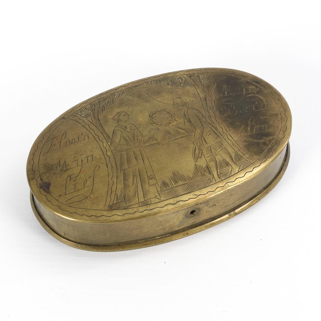 Oval box with domed bottom and hinged lid. Finely engraved lovers with probably Dutch saying; further saying on bottom. Traces from the removed clasp, otherwise little signs of age/use.
