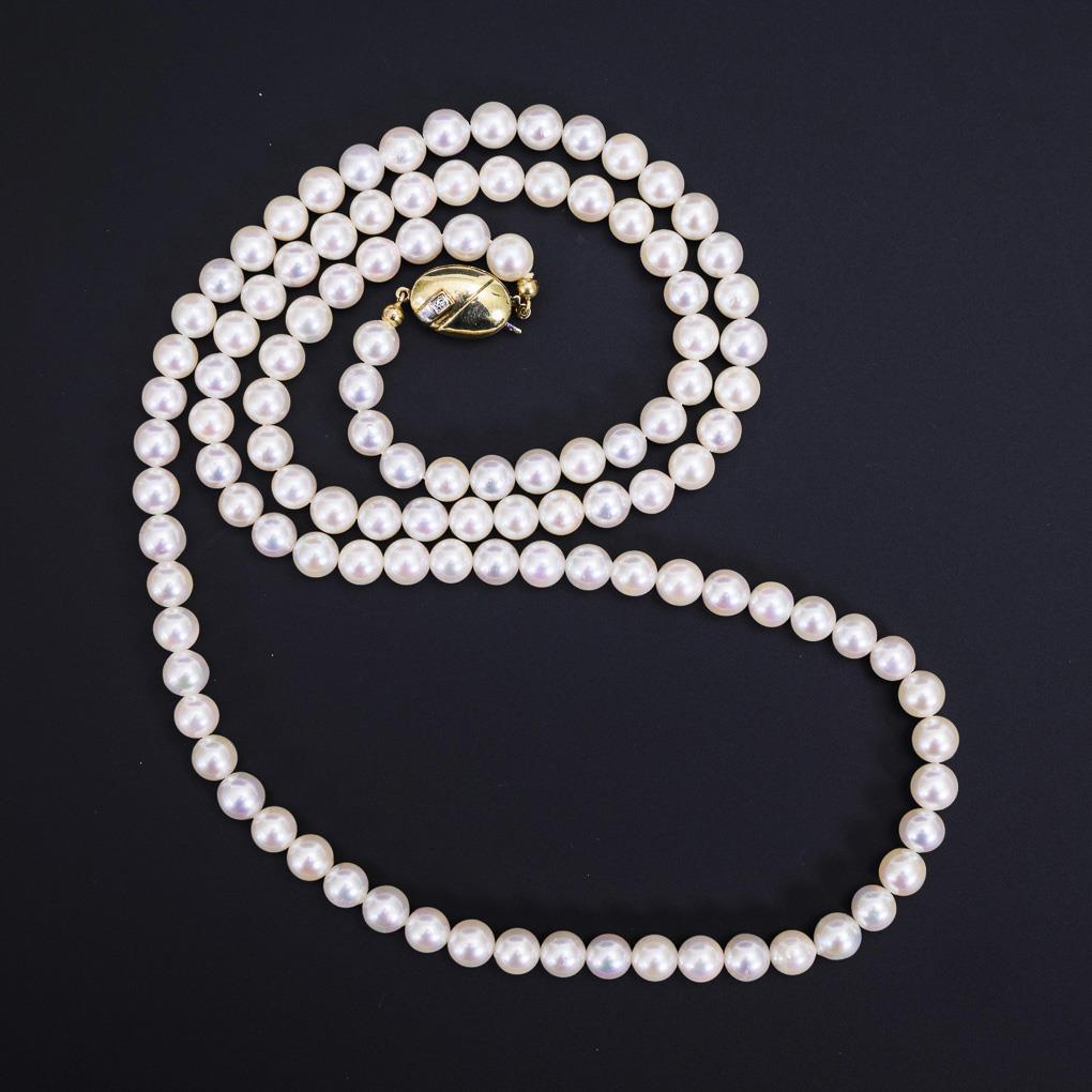 Lacing necklace with cultured pearls, on oval clasp with 2 small embedded diamonds.
