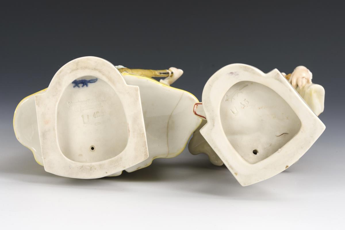 Standing figures of a hunter and a huntress in rococo dress, each with a shotgun. Rifle broken, hairline crack in the woman's skirt and bump on the woman's hat bow.