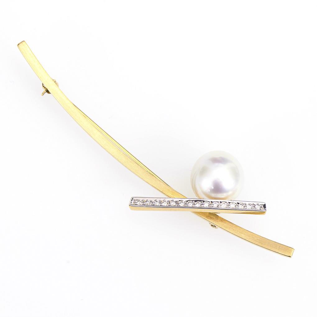 Designer brooch with large cultured pearl and diamonds.