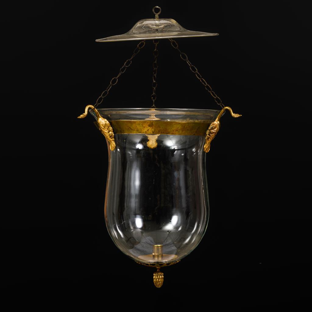 Glockenförmiger Glaskorpus an 3 kleinen Ketten mit Glas-Baldachin, antikisierendes Messinggestell. Minimale Alters-/Gebrauchsspuren.