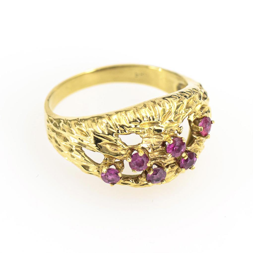 6 claw-set small rubies on openwork center, between center rail.
