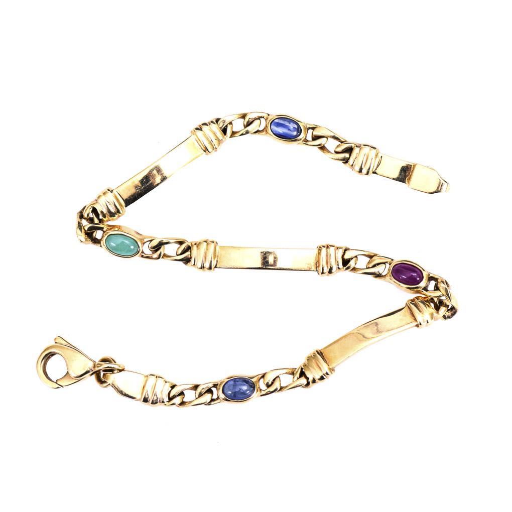 Ornamental link bracelet with 2 sapphire, 1 emerald, and 1 ruby cabochons in open bezel settings. Lobster clasp.