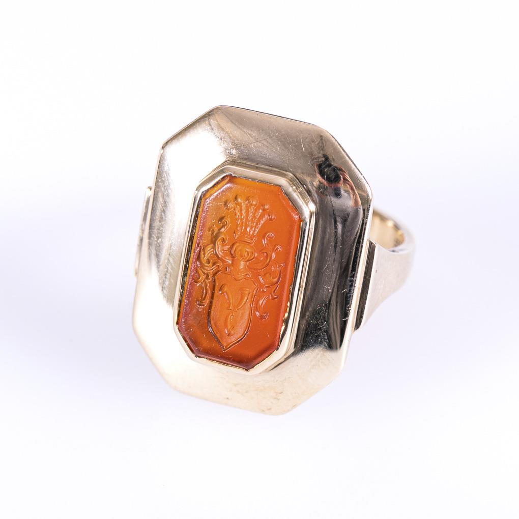 Frame-set carnelian plaque with coat of arms engraving, in wide ring head between center rail.