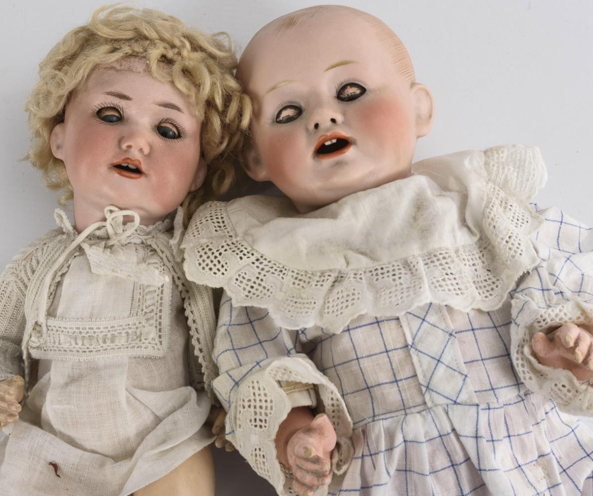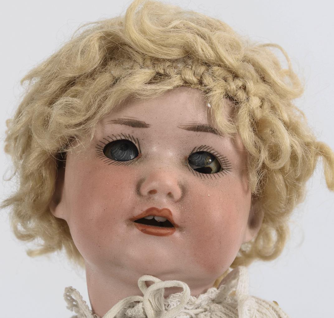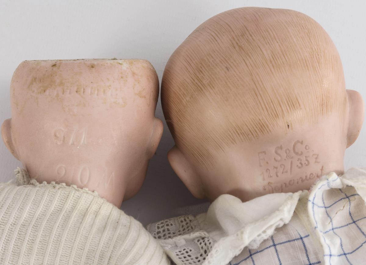 Both with crank head, sleeping eyes and mass body. Full-headed boy (Franz Schmidt 1272) with brown eyes and plaid suit. / Blonde doll (Armand Marseille 971) with mohair wig and little white dress. Head x-rayed: without defects, but eyes somewhat sunken, 1 thumb bumped.