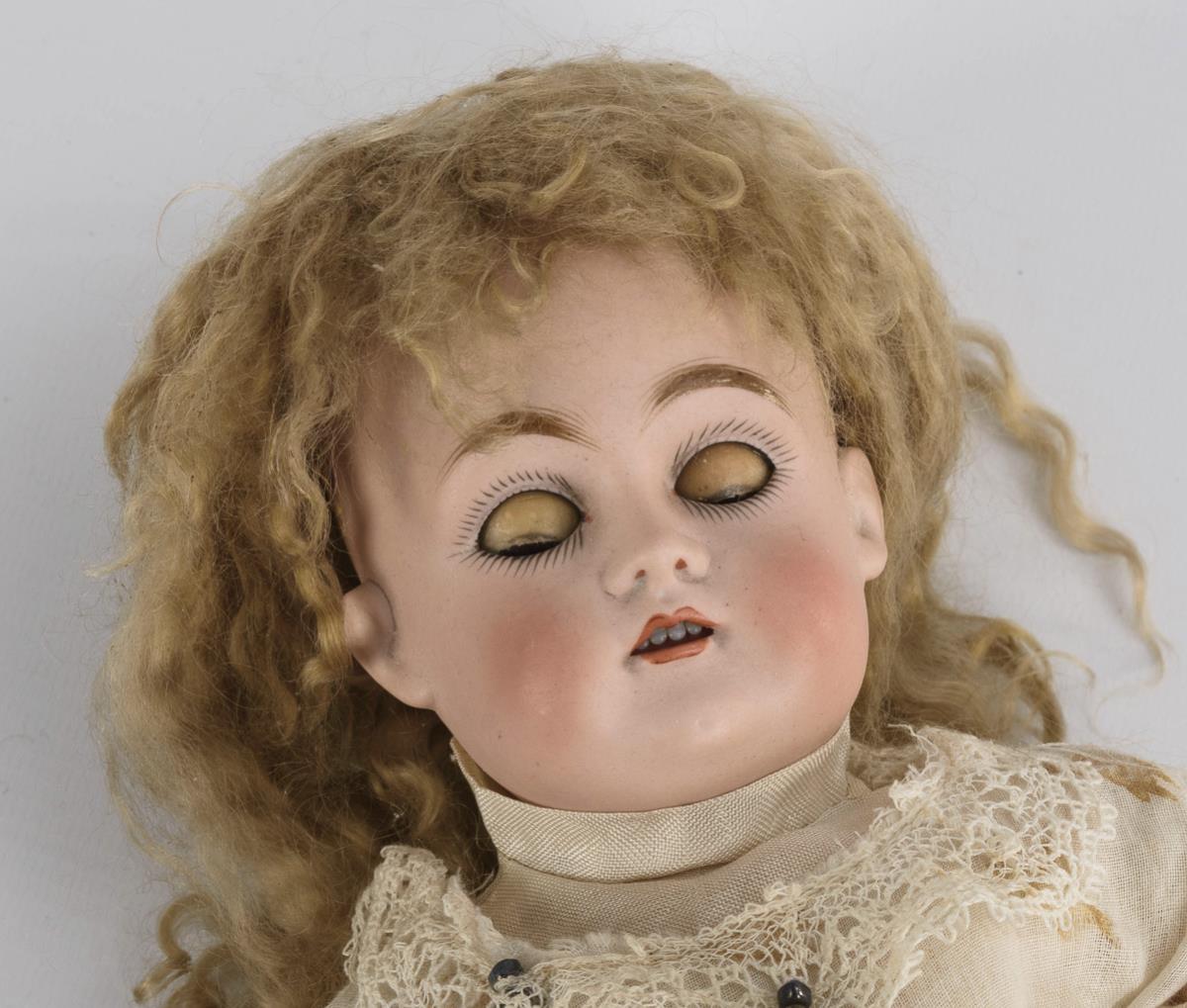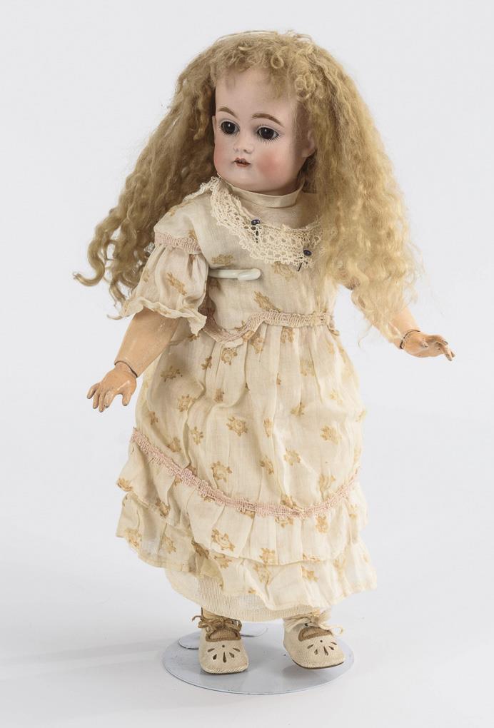 Crank head, brown sleeping eyes, younger curly mohair wig. 15-piece limb body with red stamp "Germany 0 1/2". Bright dress, white shoes. Head x-rayed: without defects. Minimal paint chips on the fingers.
