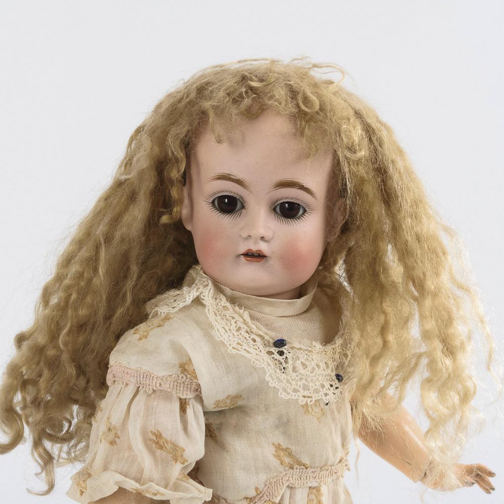 Crank head, brown sleeping eyes, younger curly mohair wig. 15-piece limb body with red stamp "Germany 0 1/2". Bright dress, white shoes. Head x-rayed: without defects. Minimal paint chips on the fingers.