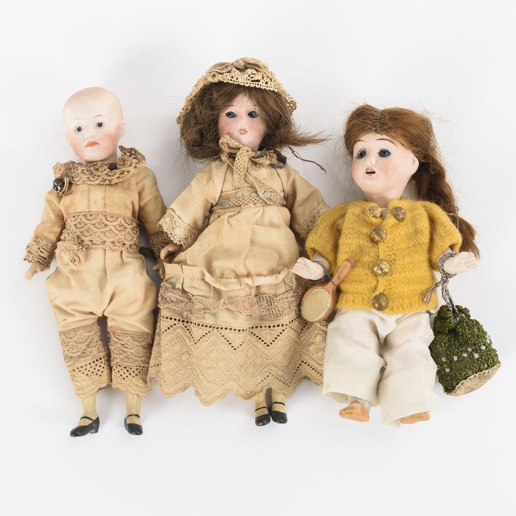 4x with crank head of bisque porcelain, 2x with chest head. All dressed in the old style. Body partly new, with defects and additions.