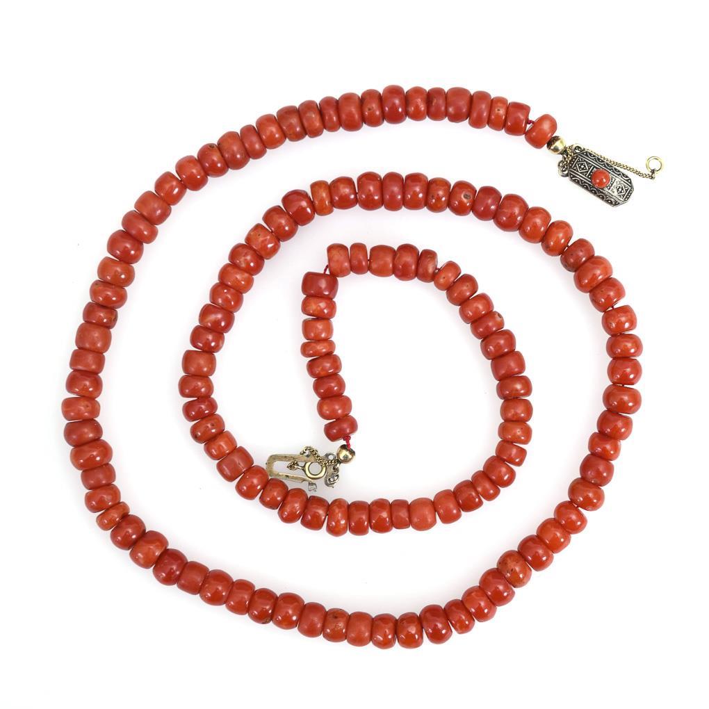 Lacing chain with coral discs, on decorative clasp with safety chain.