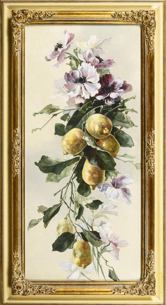 Lemons and flowers against a light background. Slight signs of age.