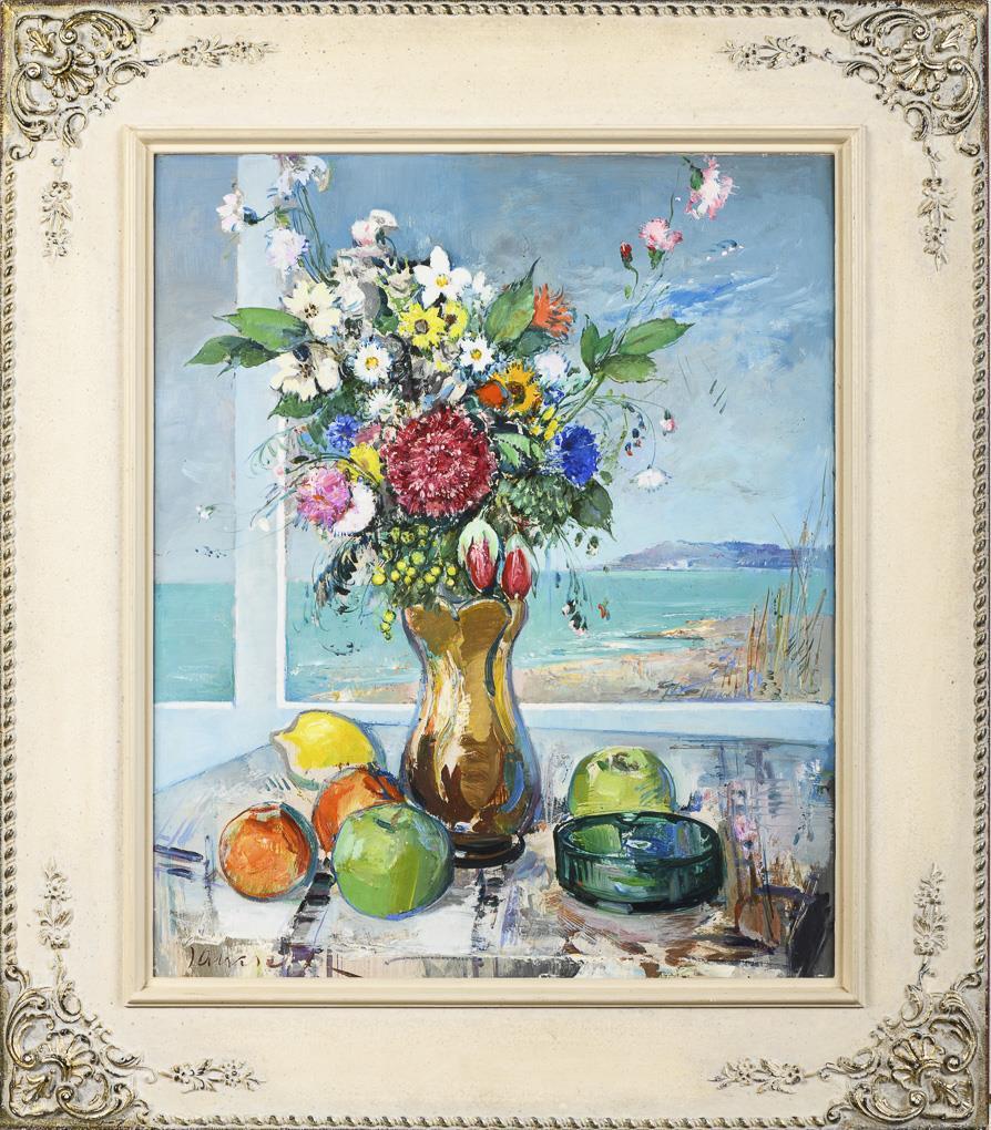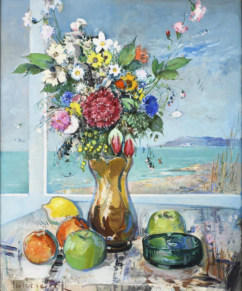 Meadow bouquet next to fruit and an ashtray on a table in front of the window overlooking the beach.
