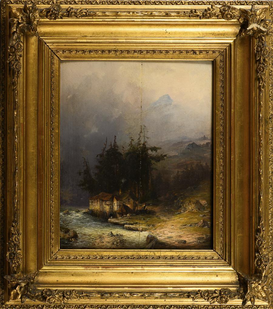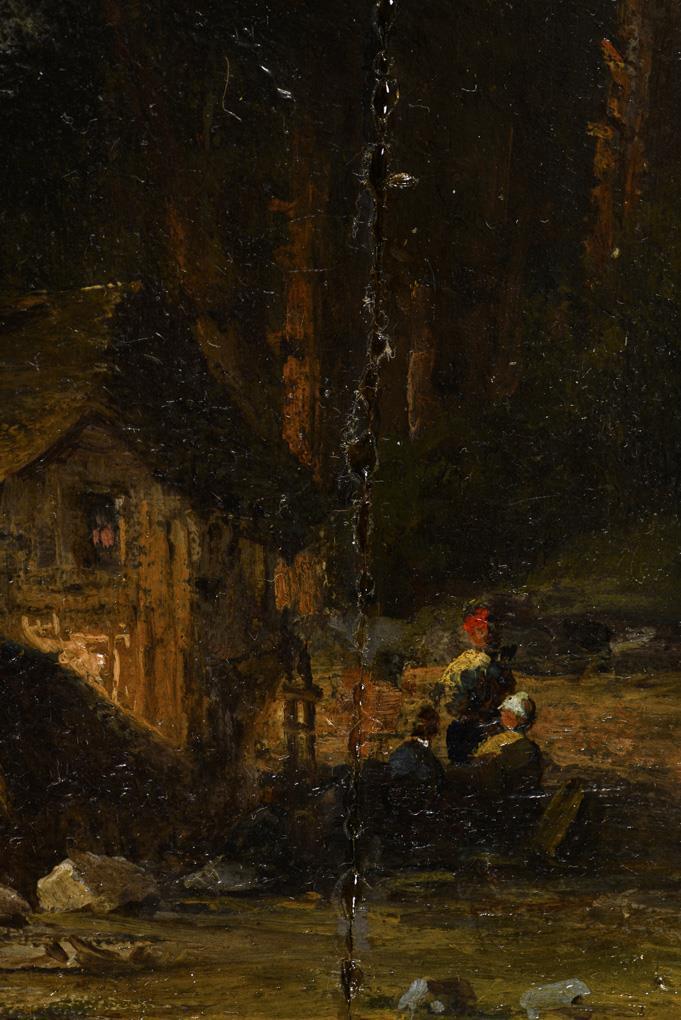Angled house on the riverbank with staffage figures as well as view over the trees to the hazy peak. Taped break in the panel with retouching, otherwise little retouched.