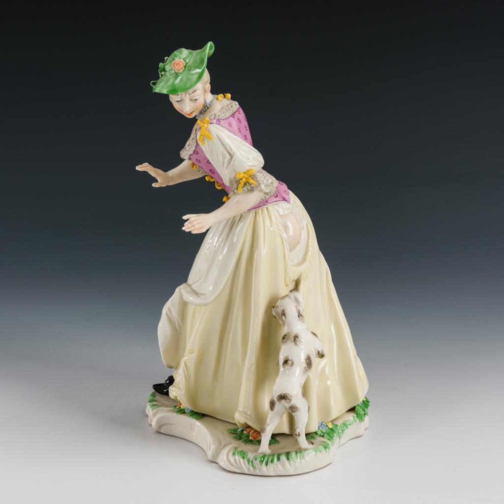 Auf einem Rocaillesockel stehende Dame, sich nach einem ihr Kleid zerreißenden Hund umschauend.