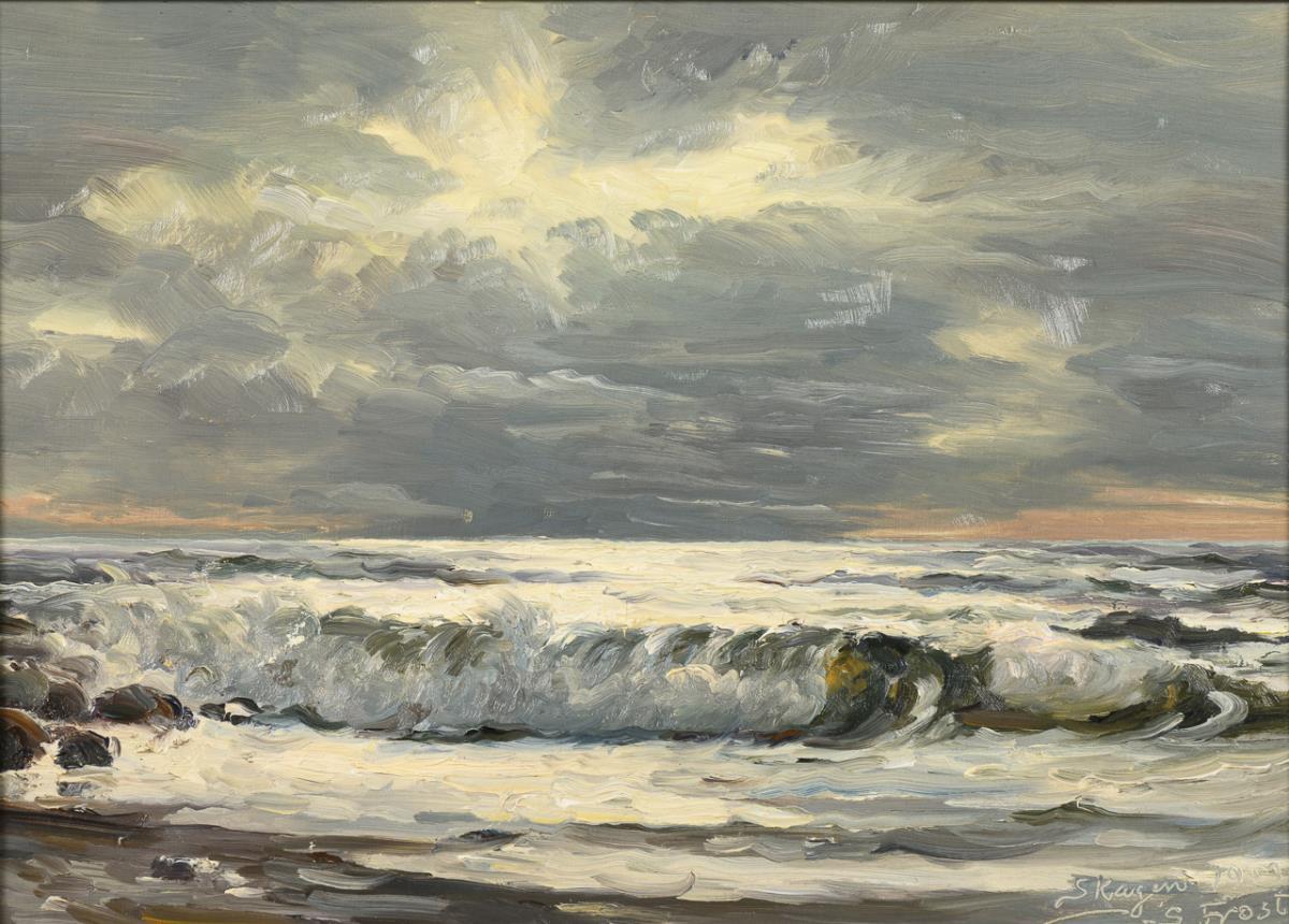 Oil / canvas. Lower right incised signature with indistinct date and place name Skagen, verso Danish dedication of 1945.