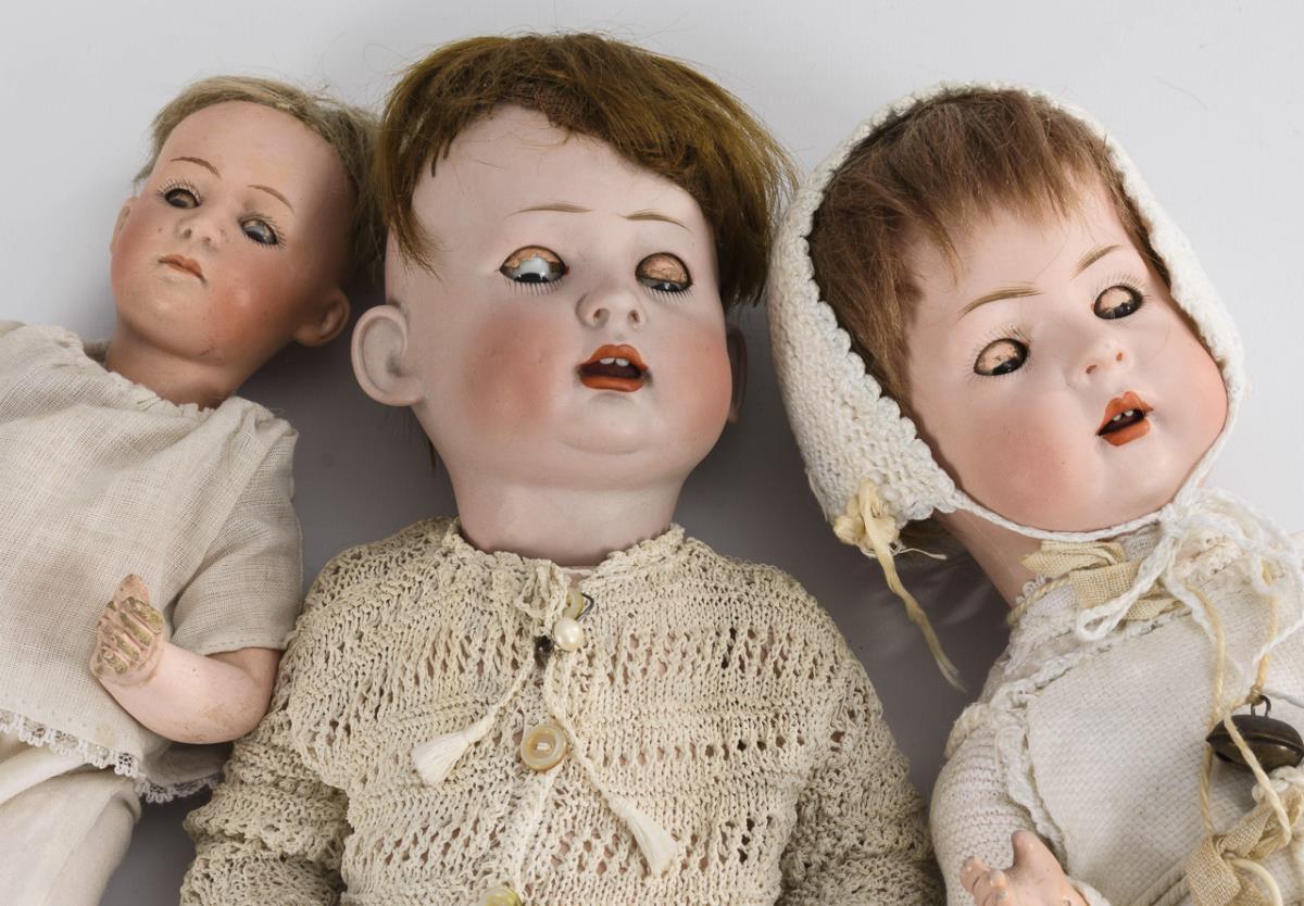 All with crank head, sleeping eyes, mohair wig, 5-piece sitting baby body and white clothing: Little Heubach Boy (sun mark 7240). / Baby doll in crochet clothing (Hertel, Schwab & Co for König & Wernicke 179). / Baby doll (Bruno Schmidt) with long dress and rattle. In addition, white wicker chair. Heubach head restored. Body each with small bumps.