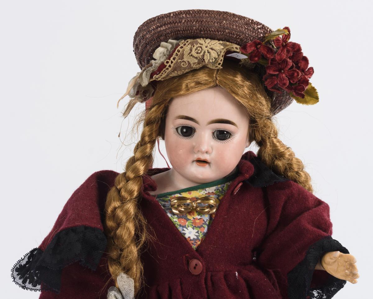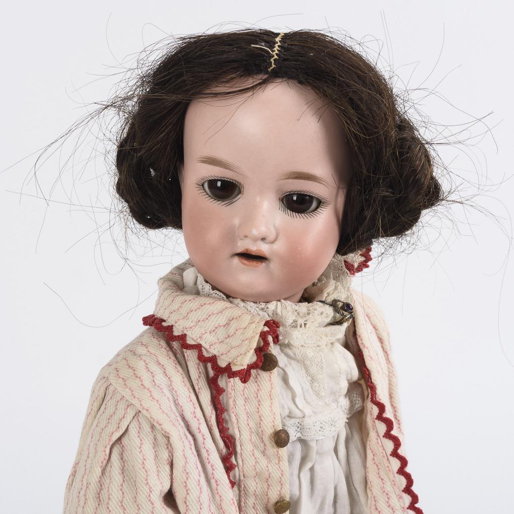 Both with brown sleeping eyes. 1x Crank head, brown human hair wig, 11-piece articulated body, white nightgown and robe. 1x chest head, synthetic hair wig with braids, leather body, flowered dress and burgundy coat. 390 with hairline crack and 2 defective fingers. 3200 without eyelids.