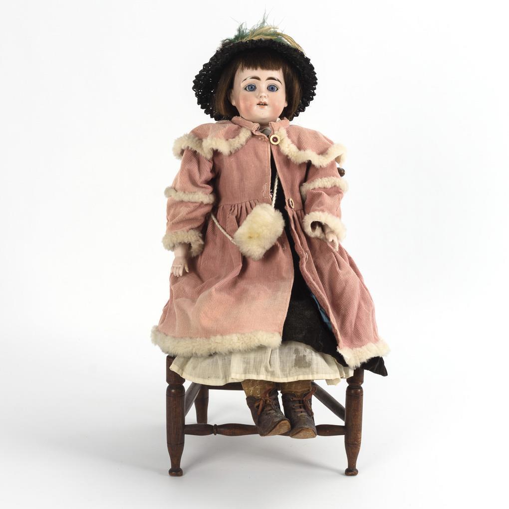 Chest head, blue sleeping eyes, brown human hair wig. Leather body with bisque forearms. Brown velvet dress, pink corduroy coat, black straw hat, brown leather shoes. Head x-rayed: without defects. Right hand restored.