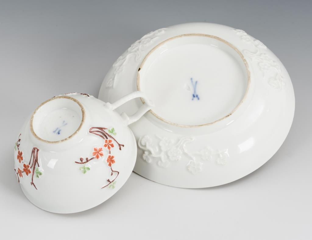 Tasse und Untertasse mit Prunusrelief. Im Spiegel der Tasse indianische Blumenmalerei, im Spiegel der Untertasse die Darstellung eines rastenden jungen Mannes in einer Landschaft, Goldspitzenbordüre. Partieller Goldabrieb, Bestoßung am Standring der Untertasse.
