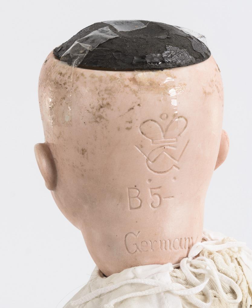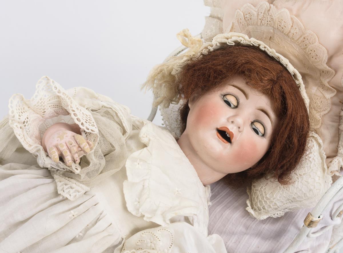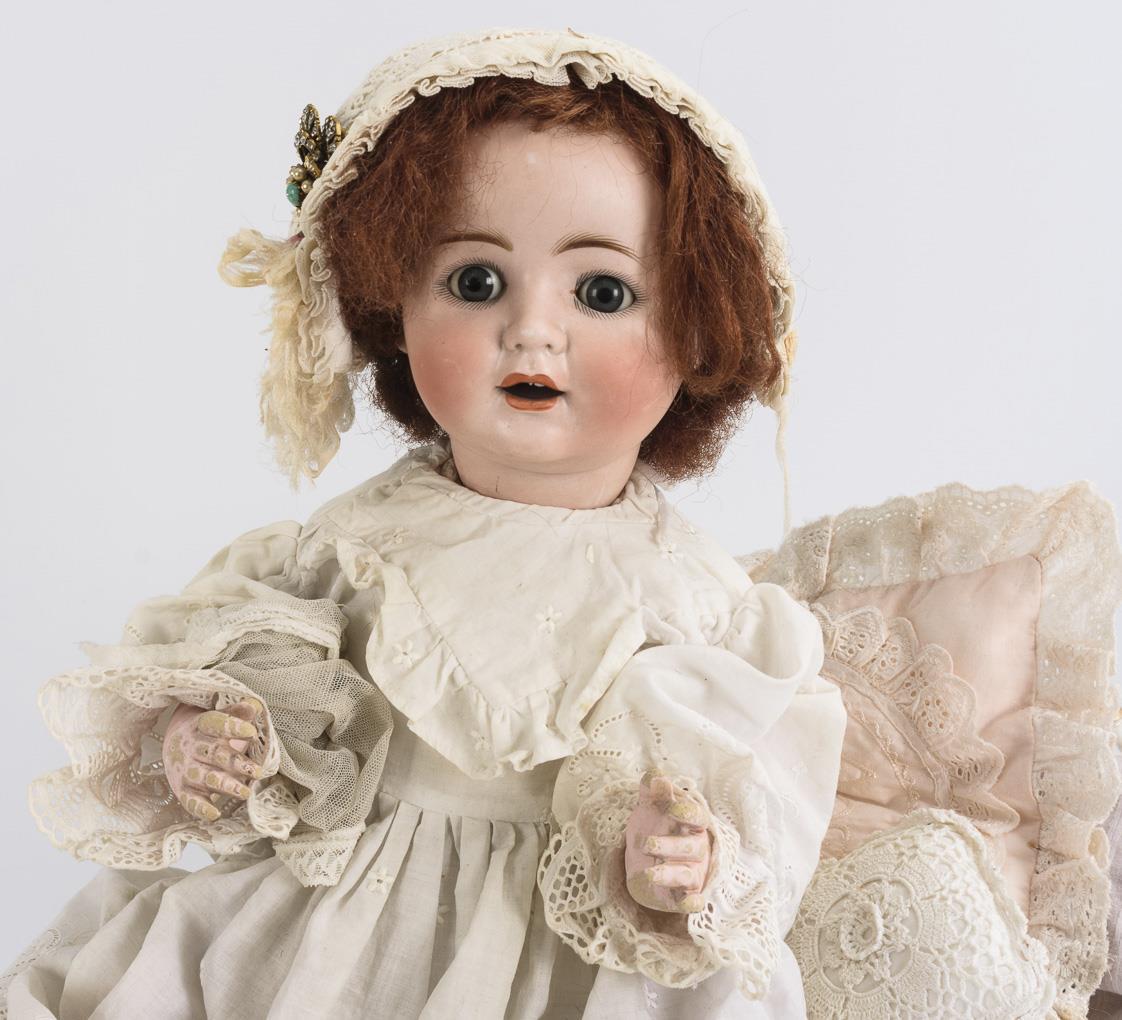 Crank head, blue sleeping eyes, red synthetic hair wig. 5-piece sitting baby body. White dress, hood, defective leather shoes. Comes with white metal crib with pillow and blanket (39 x 29 x 64 cm). Head x-rayed: without defects. Played with, signs of age.