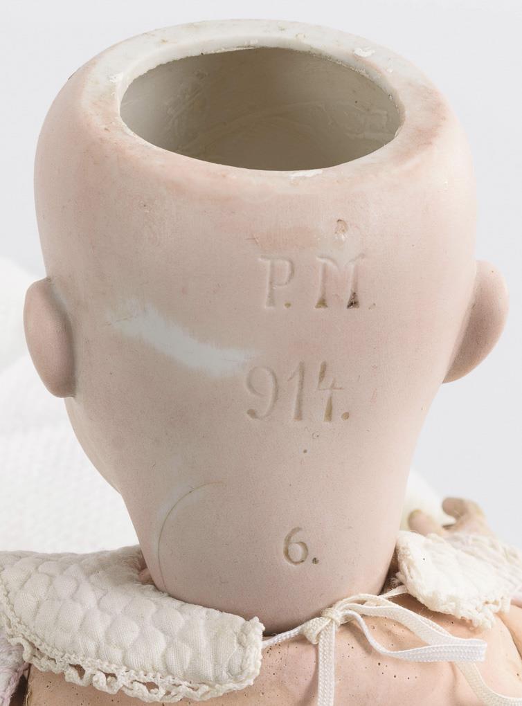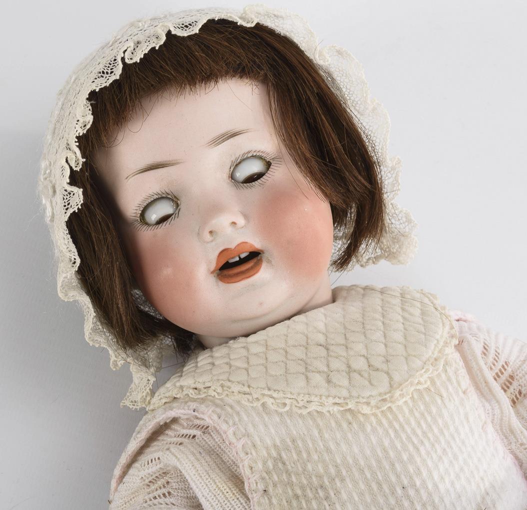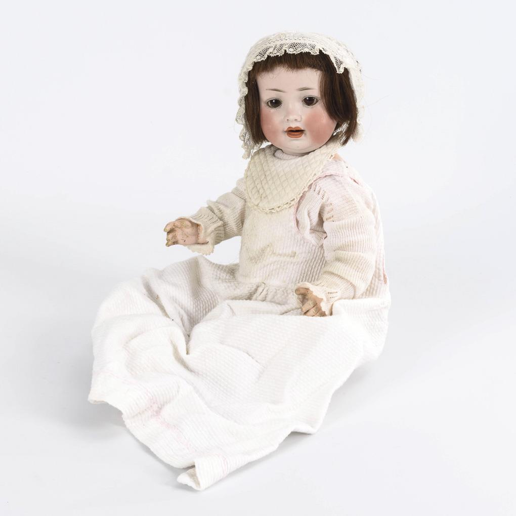 Crank head, brown sleeping eyes without eyelids, brown human hair wig. 4-piece sitting baby body with supplemented intact voice (voice hole on the belly). White baby clothes. Short hairline crack in the neck. Hands a little rubbed.