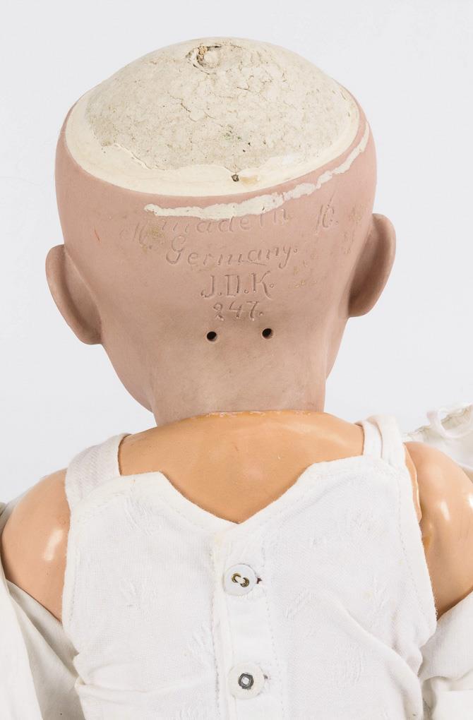 Crank head, blue sleep eyes, blond mohair wig, plastered head cover. 5-piece sitting baby body. White shirt, white shoes. Long hairline crack on the forehead. Small color defects and retouching on the body.