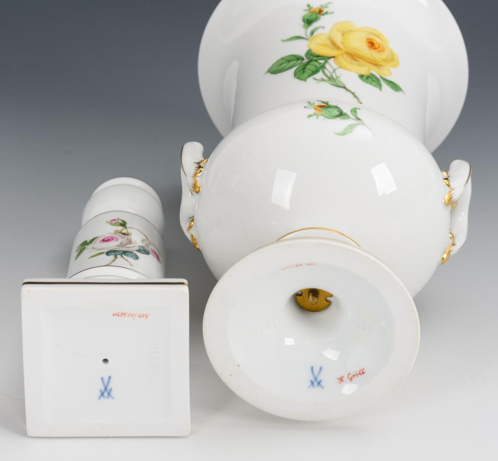 Fußvase mit dem Dekor "Gelbe Rose" und Kerzenleuchter mit weißen Rosen.