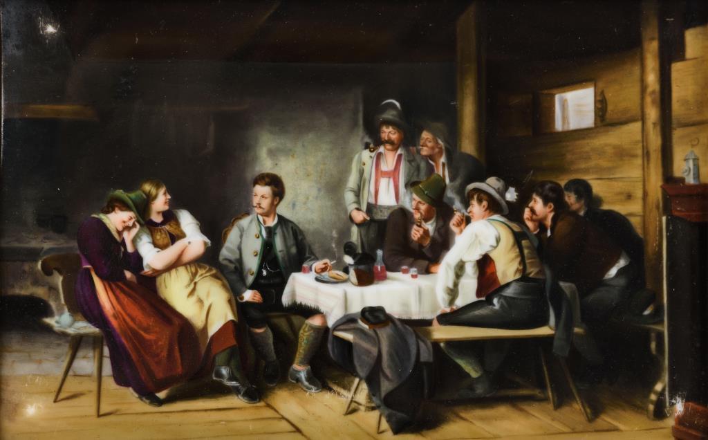 Rechteckige Platte mit der Darstellung einer Bauerngesellschaft in einer Tiroler Stube, nach einem Gemälde von Franz von Defregger (1835-1921). Kratzspuren an den Ecken.