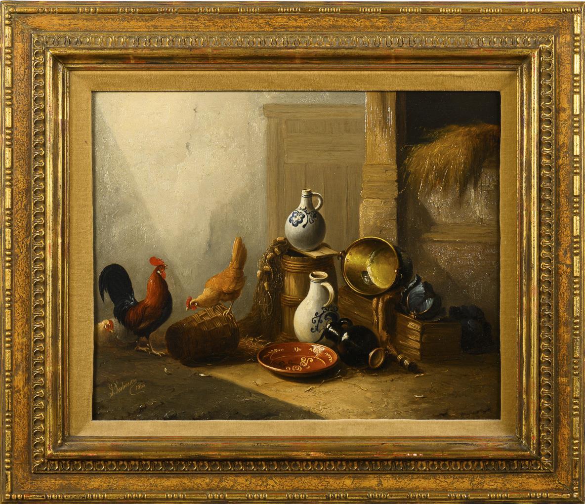 The chickens rummaging next to the shiny ceramic and metal vessels in the barn.