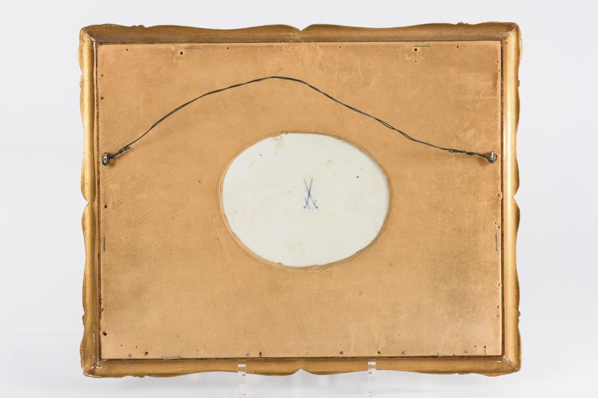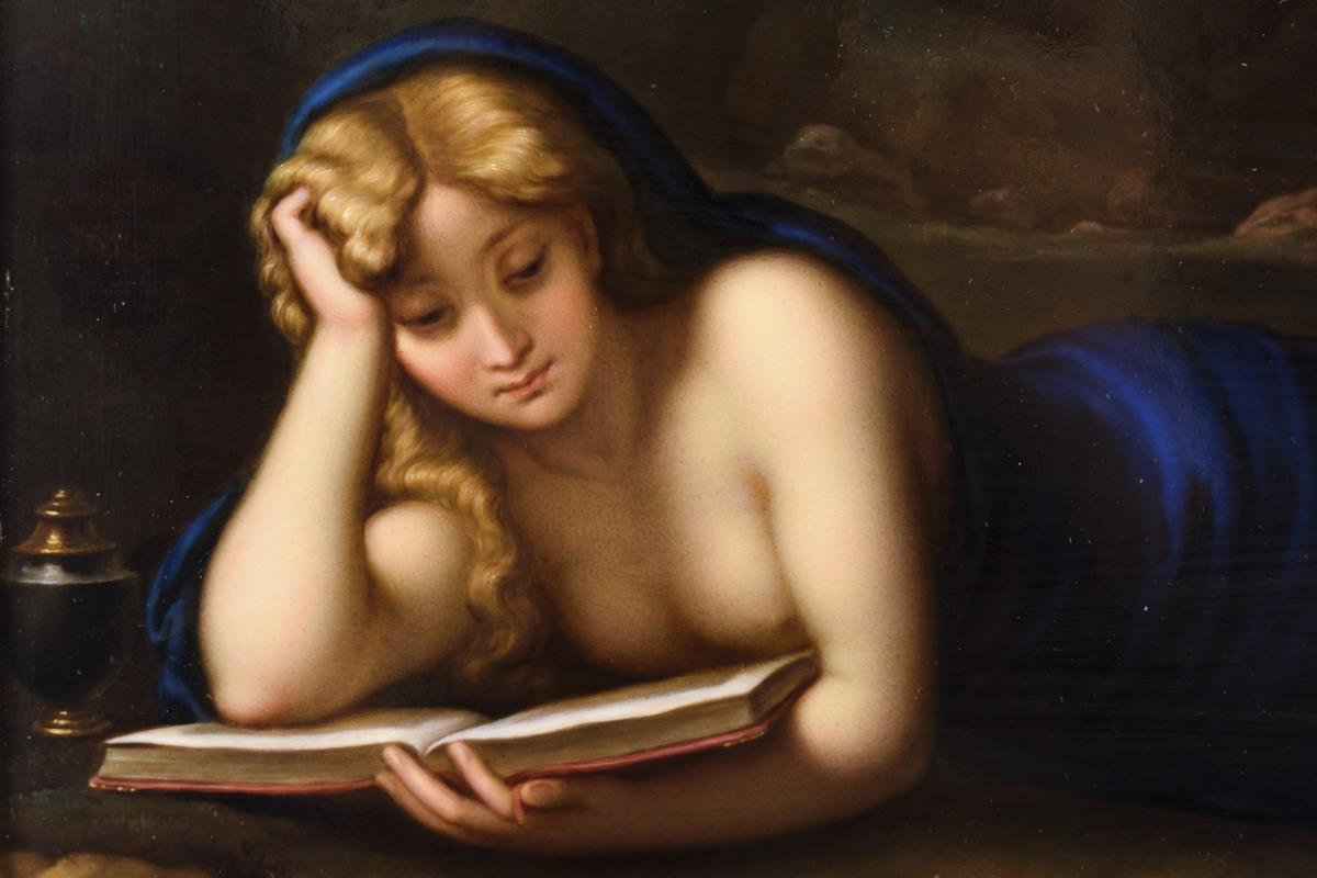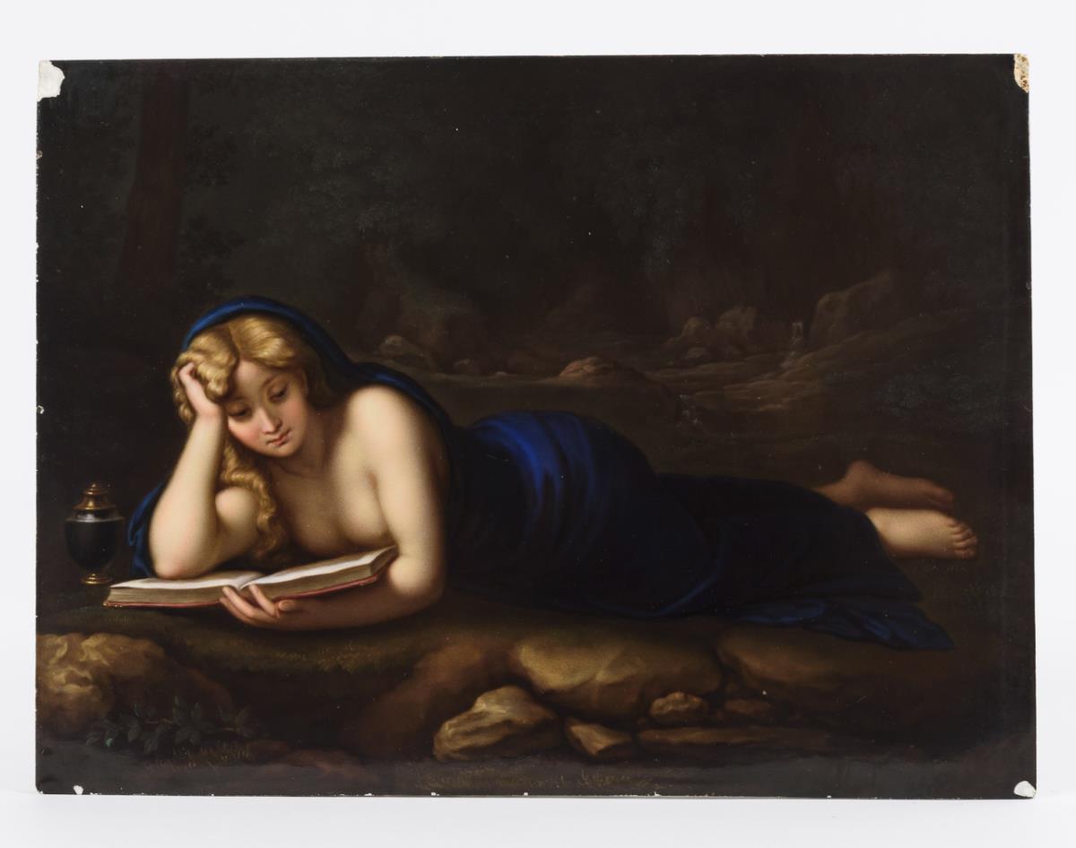 Rectangular picture plate depicting Mary Magdalene lying in a barren landscape, reading a book, after a painting by the Italian painter Antonio da Correggio (1489-1534). Corners bumped.