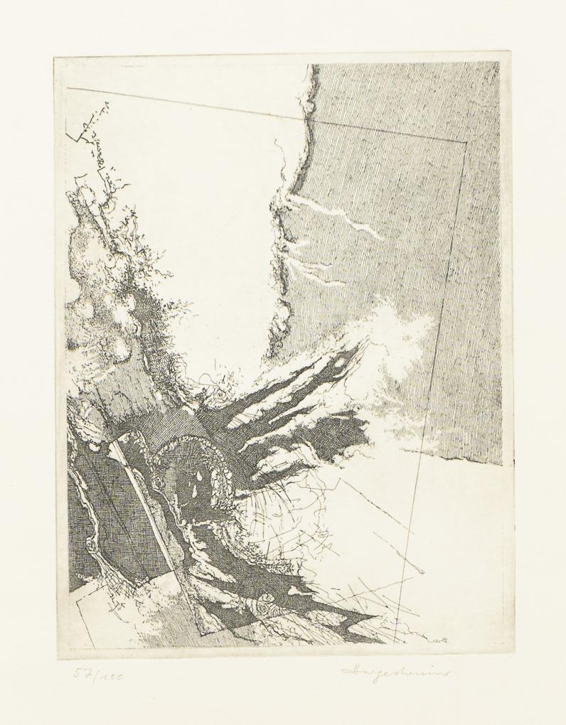 Hargesheimer, Eckhard: Abstract work, etching, pencil signature, copy: 57/100, plate: 20 x 15 cm, framed & behind glass: 50.5 x 40 cm | Indistinctly signed: Organic form, etching in blue, pencil signature, copy: 40/100, [19]69, plate Ø ca. 17 cm, framed & behind glass: 48.5 x 40.5 cm | Indistinctly signed: Abstract work, color silkscreen, copy: 8/100, [19]70, image: 321 x 22 cm, framed & behind glass: 48.5 x 40.5 cm. Each minimally griffspurig.