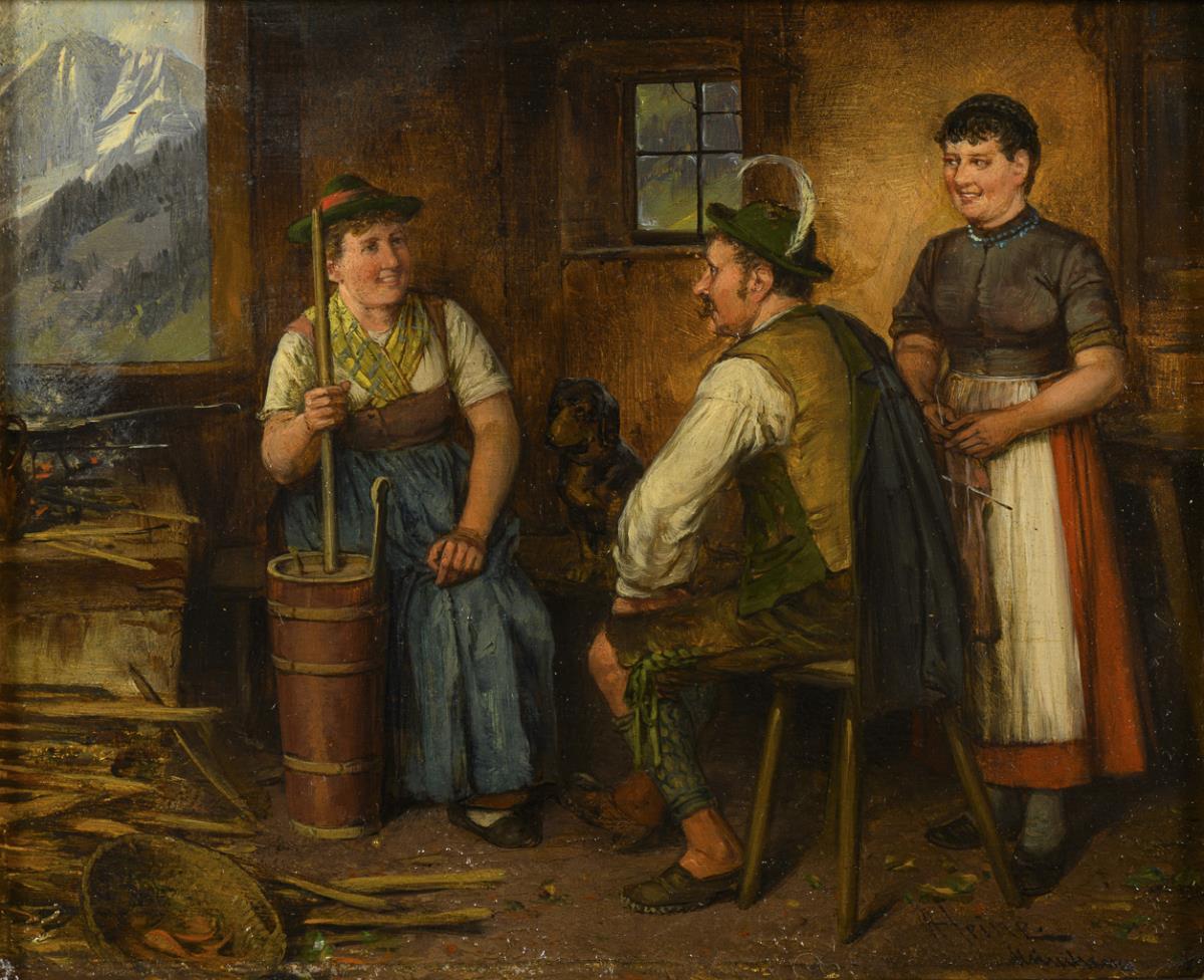 Butter making woman and guitar playing man in conversation, respectively. Each in a peasant kitchen with burning hearth fire and view of the Alpine landscape. 1x minimal paint abrasions on the edge.