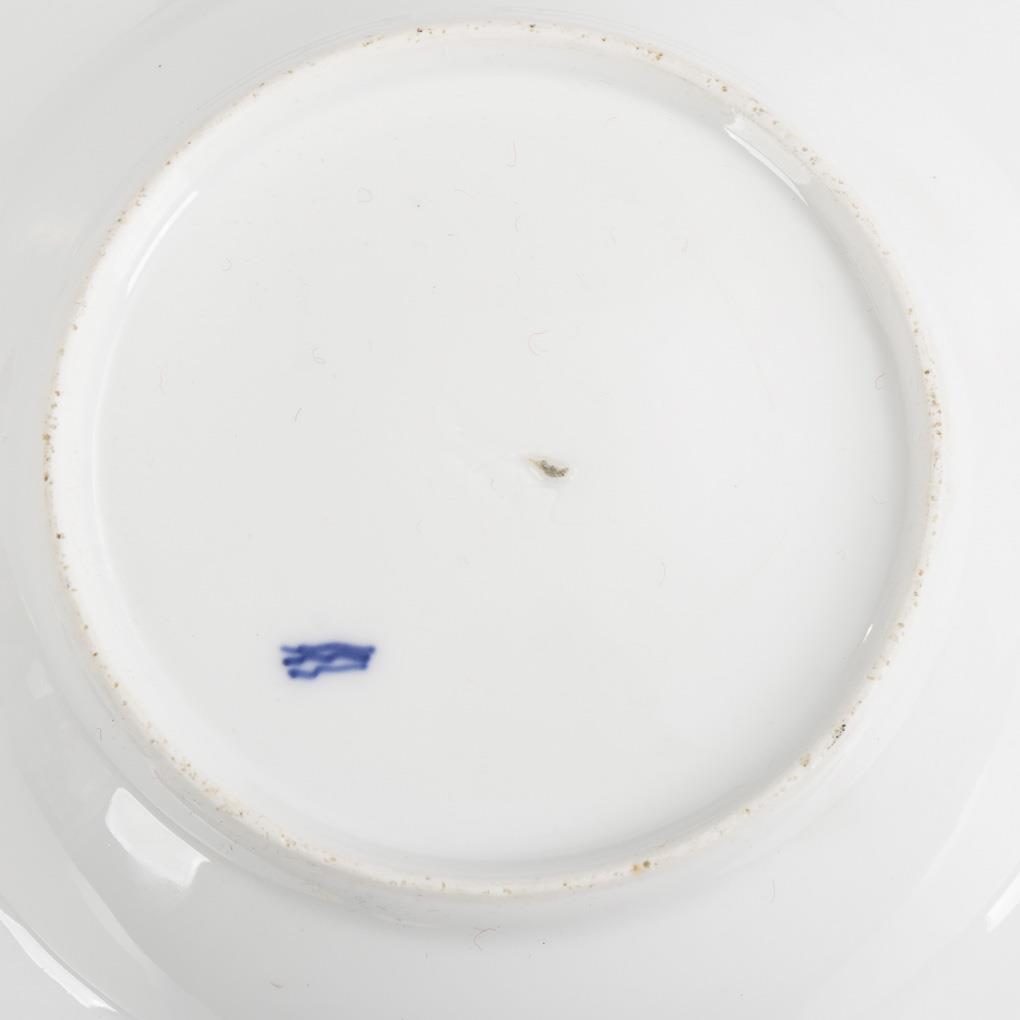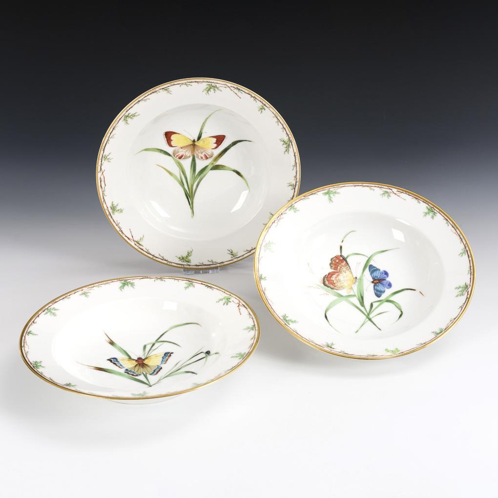 Soup plate depicting a butterfly in a mirror and a floral border. 1x with rim hairline crack.