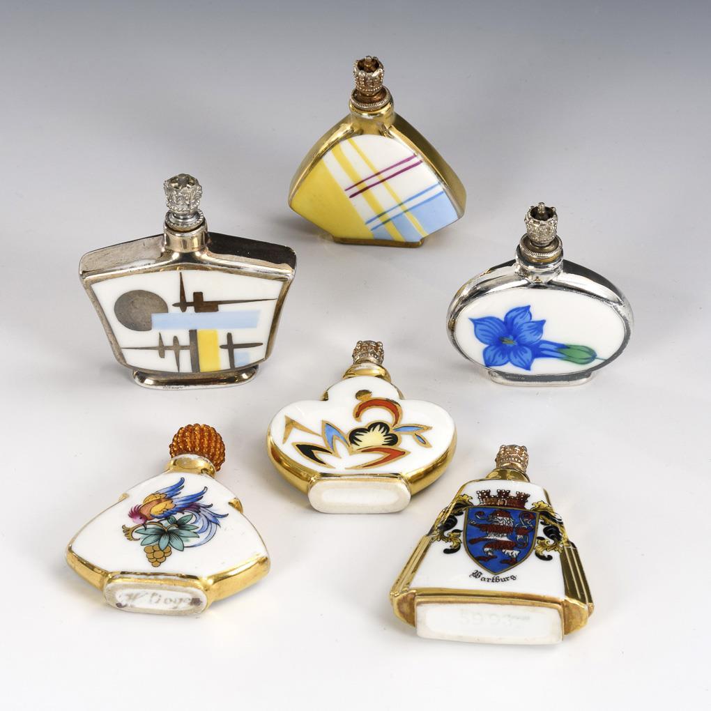 Various art deco flacons, some with geometric decoration, 1x with floral decoration, 1x with bird decoration and 1x with coat of arms. Partial gold rubbing.