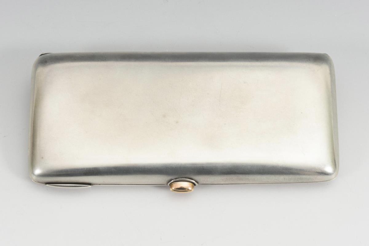 Silver cigarette case with applied monogram.