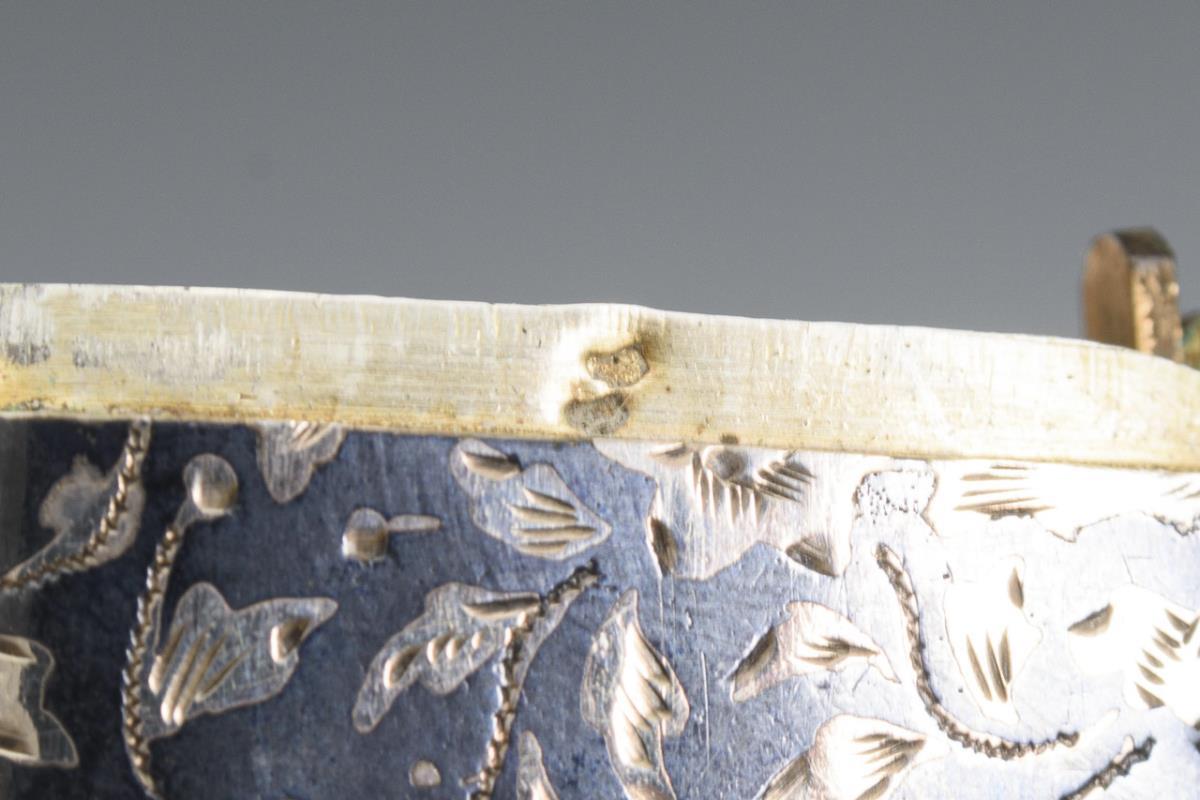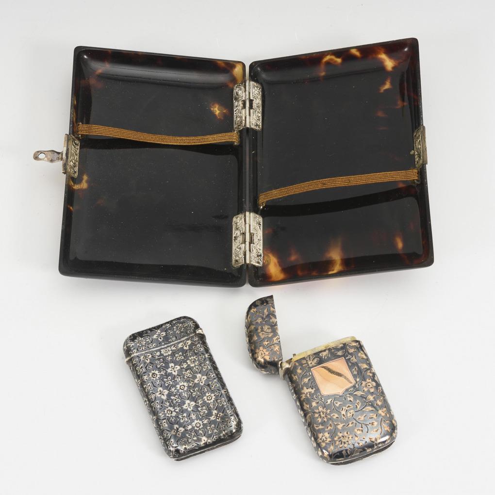Very elaborate cigarette case made of tortoise shell with silver and colored mother-of-pearl inlays. On the lid engraving "Anne Marie André" (10.5 x 7 cm). 2 small match cases decorated in niello technique (5 x 3 cm each). Minimal missing parts.