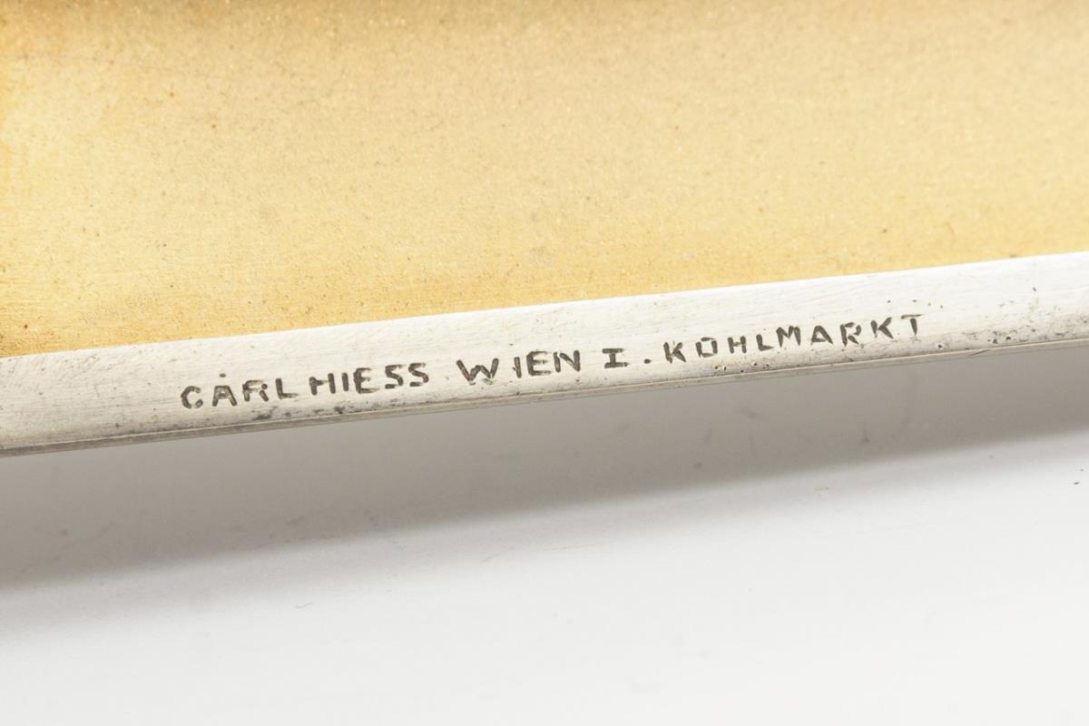 Elegant case with surrounding meander band. On the lid cabochon of rock crystal? with engraved heraldic animal. Inside gilt, with dedication: "1.IX.15 - 15.X. 27". Underneath 1 small dent.