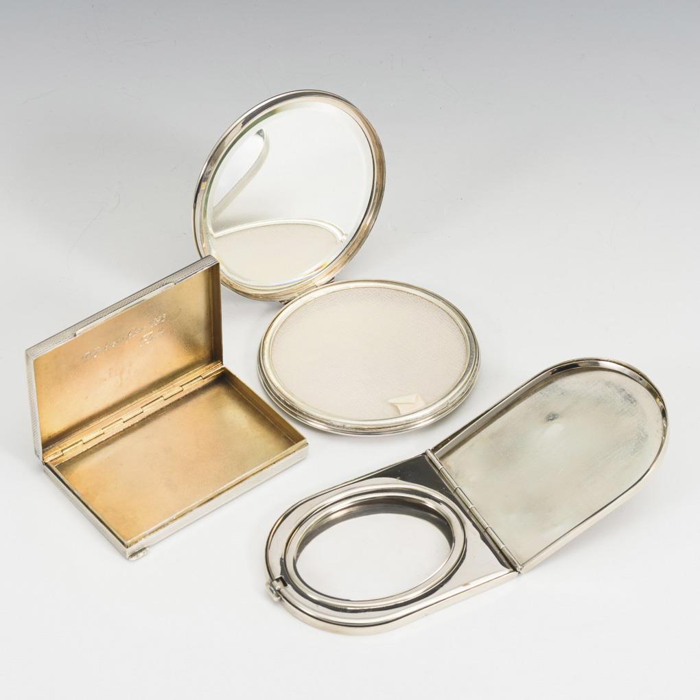 Round compact (925) with inner mirror, semicircular box (935) and rectangular case (900) with inner gilding and engraving "Christmas 1938. Flotti". Signs of use, 1x with inner frame without mirror.