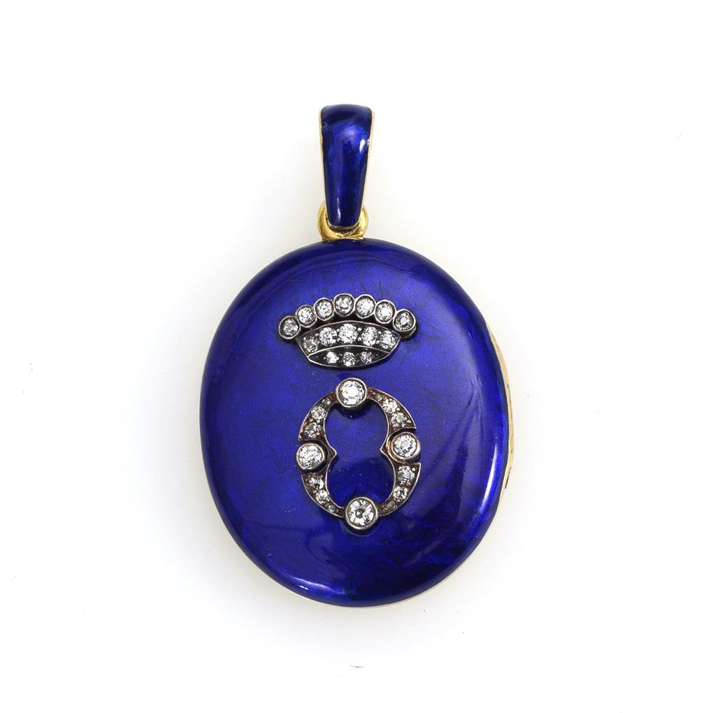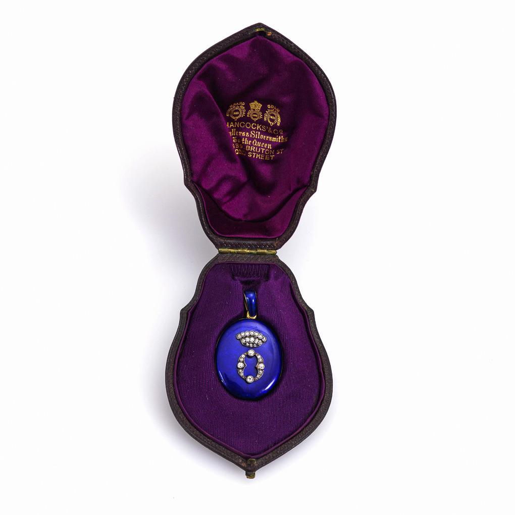 Victorian royal blue enameled medallion. Crowned "O" with 31 silver-set old-cut diamonds. Framed glazed interior compartment. Brown case by HANCOOKS` & Co Jewellers & Silversmiths To the Queen 38 & 39th Bruton St Bond Street.