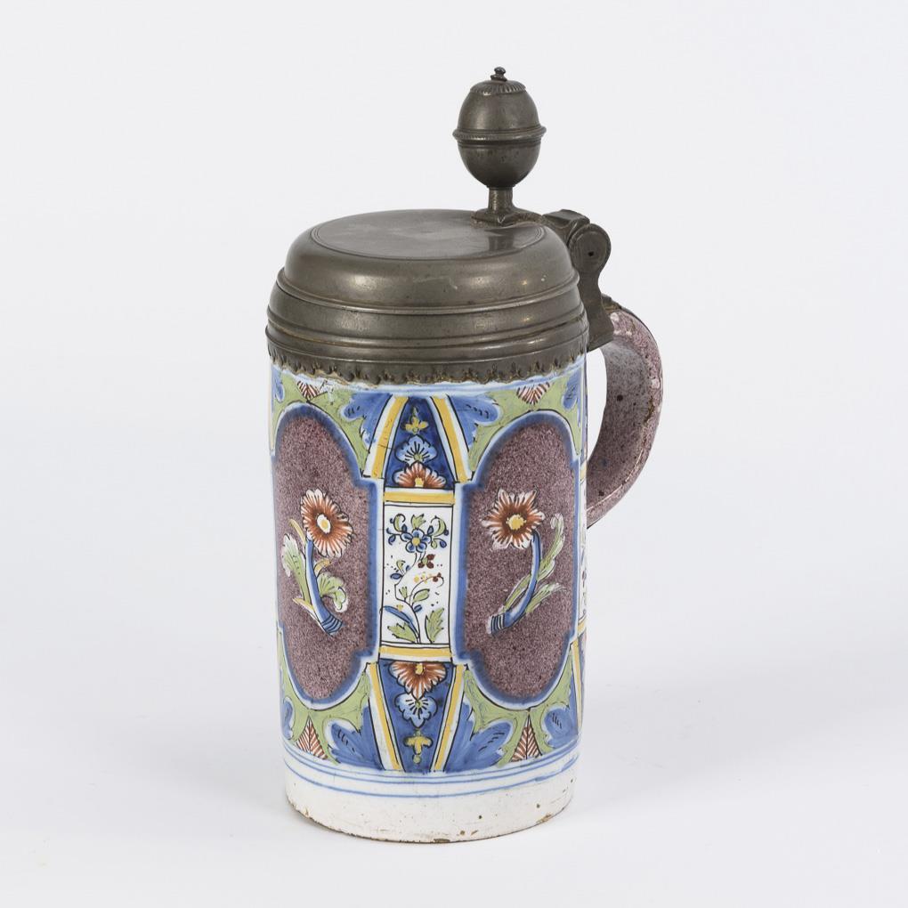Cylindrical jug with ribbon handle. Circumferential niche decoration with single flowers on manganese asphalt ground. Pewter lid with ball pusher and handle band. Slightly bumped, fine cracks, glaze rubbing, pewter partially defective.