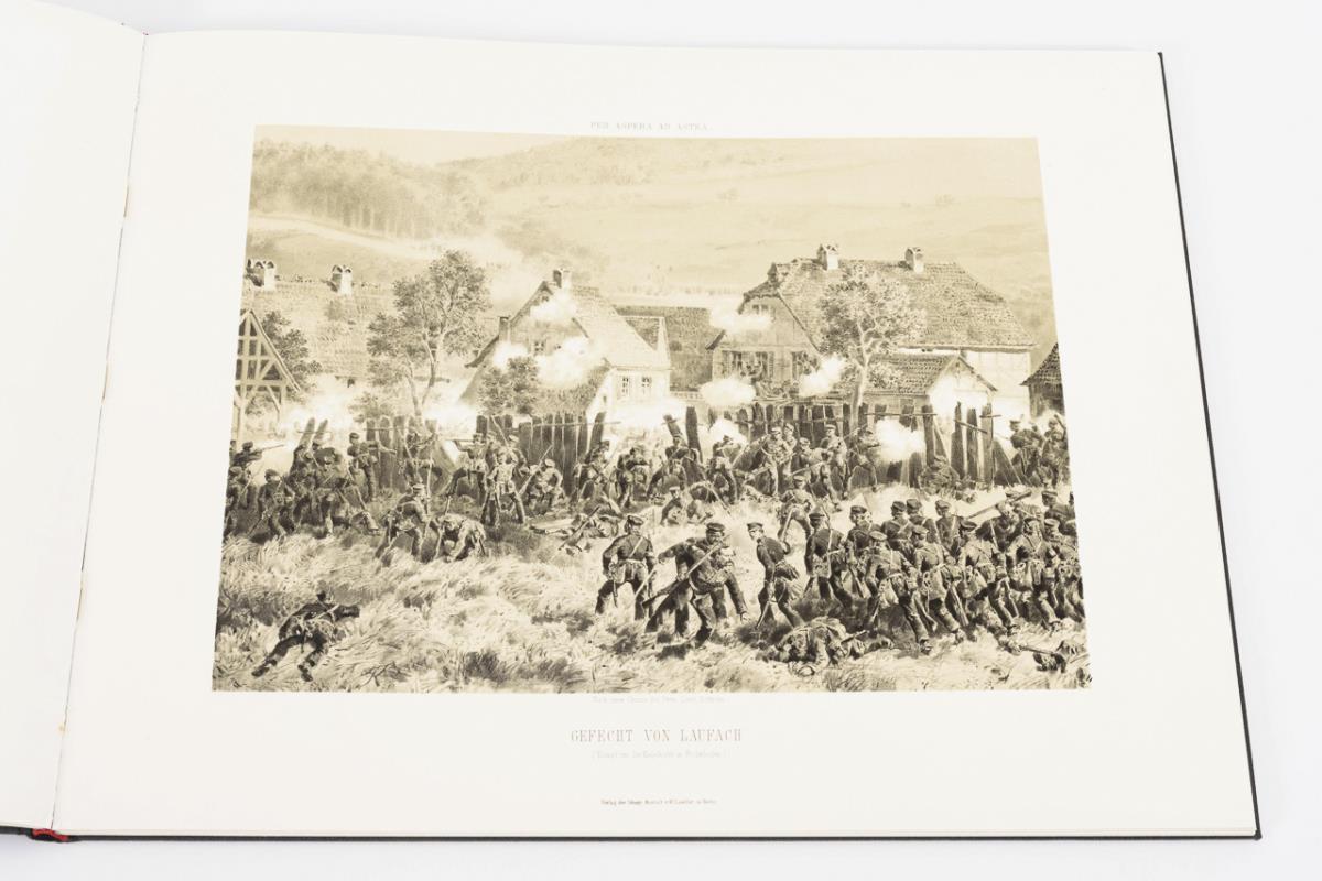 24 large-format lithographs (complete) with battle depictions from the war and 2 pages of text. Cloth binding with gold lettering.
