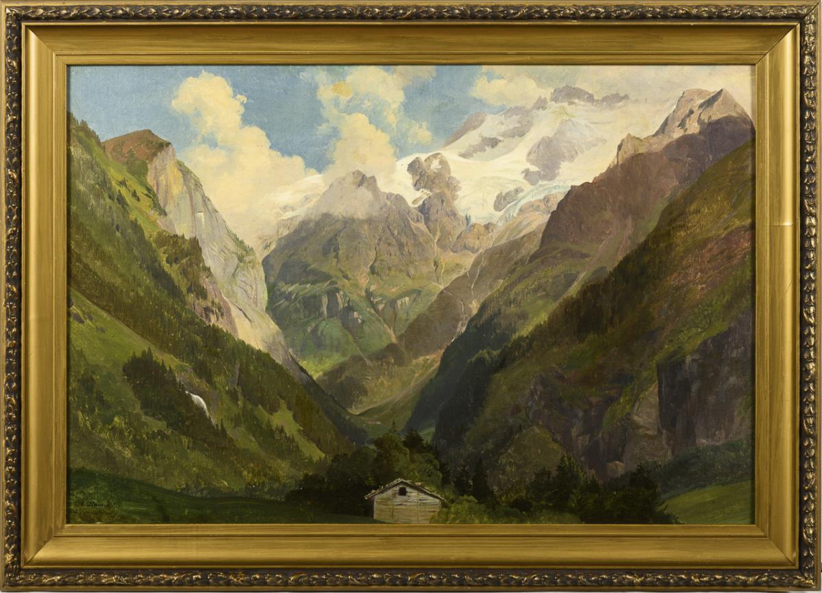 Alpine panorama with mountain hut on the meadow slope and view over the valley to the snow-covered peaks in the sunshine. Altersspuren.