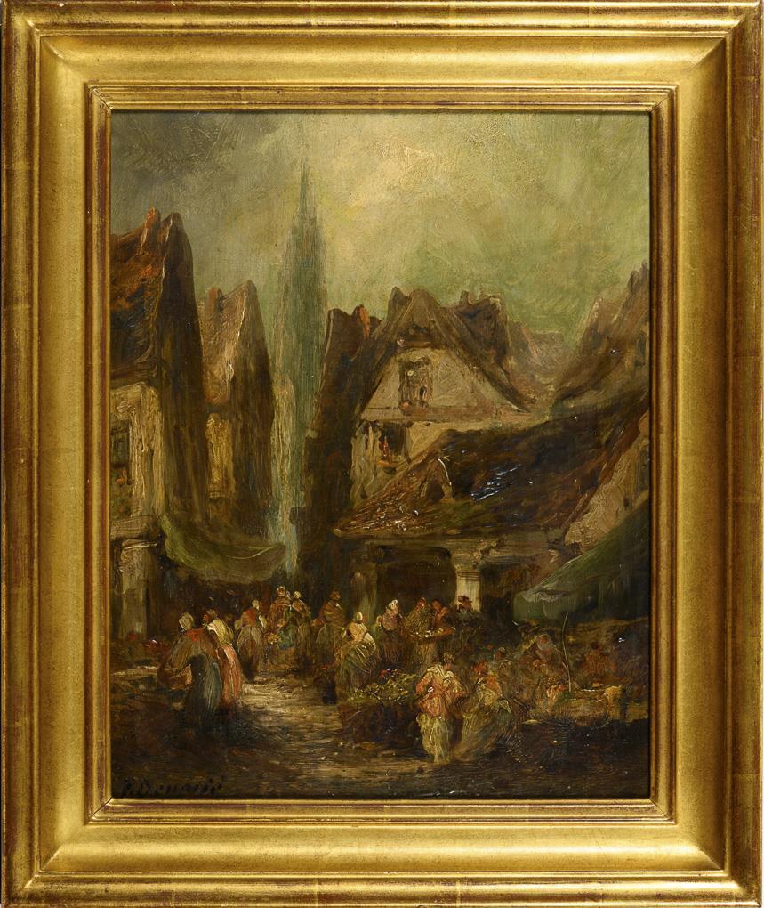 Many-figure market scene in the bright light as well as view through a narrow alley to the high church tower. In the sky probably retouched, minor traces of age.
