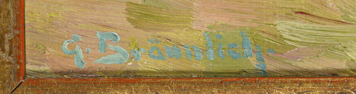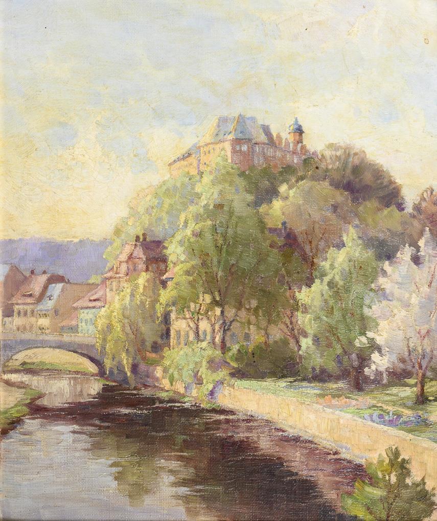 Landscape format canvas painting "Partie an der Elster, Neue Welt, Greiz/Thür." titled. / The upper castle of Greiz. / Church in the park. / Park on the White Elster. Mostly somewhat scrawled, each a little dirty.