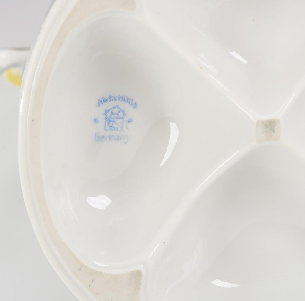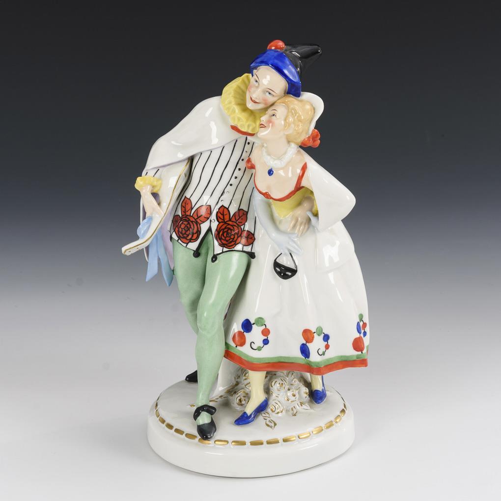Pierrot standing on a round base, embracing the pierrette. Minimal glaze chipping at the tip of the pierrot's hat.
