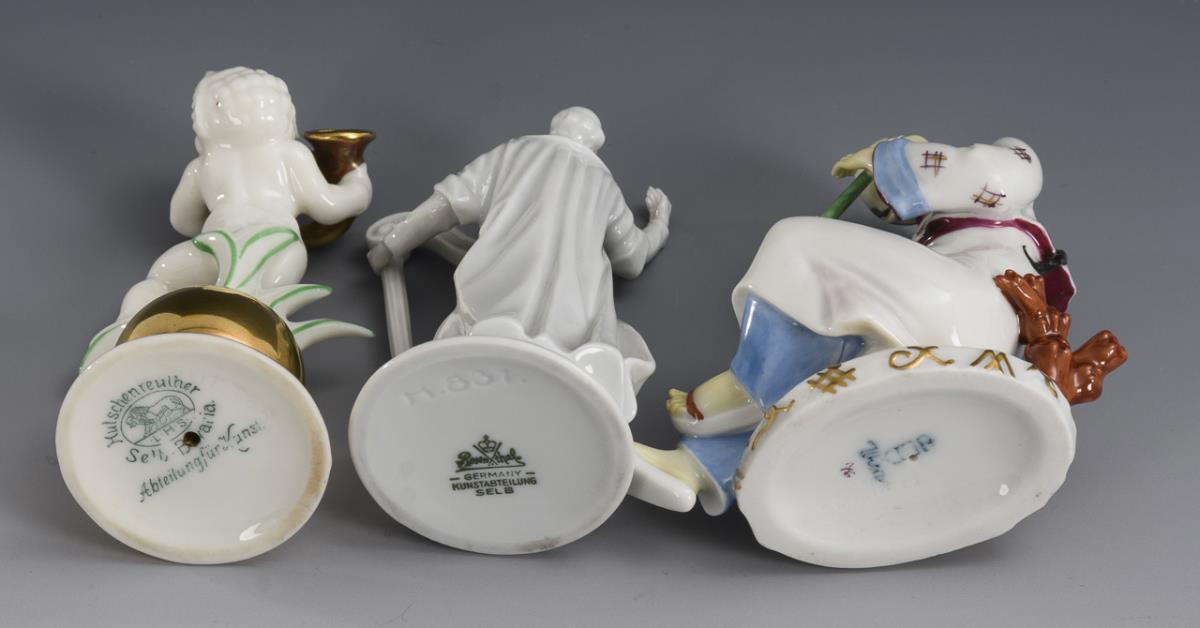 1x marked Rosenthal 1948, model no. K 837: bearded man with harp. / 1x marked Hutschenreuther, 1918-1938: putto standing on a golden ball, playing a French horn. / 1x marked Augarten, c. 1930: seated Chinese playing a flute. Flute of the Chinese and 1 thumb of the apostle bumped.